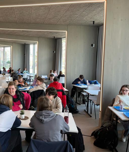 Und alle waren überwältigt! Viele Sitzplätze, große Fenster für einen tollen Blick auf unseren grünen Schulhof, helle Naturmaterialien. Persönliches Highlight unserer Schülerinnen und Schüler: die kleine Bühne mit Sitzgelegenheiten, die einen guten Überblick über den Raum ermöglichen.
