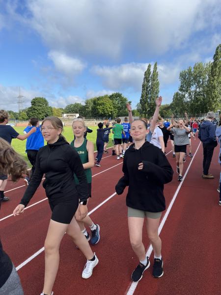Am heutigen Dienstag versammelten sich alle Schülerinnen, Schüler der 7. bis 9. Klassen und die meisten Lehrerinnen und Lehrer um 7.45 Uhr im Stahlstadion am Quenz, um mit motivierenden, einleitenden Worten von Herrn Tietz und Elisa (Jahrgangsstufe 11) in den sportlichen Tag zu starten.