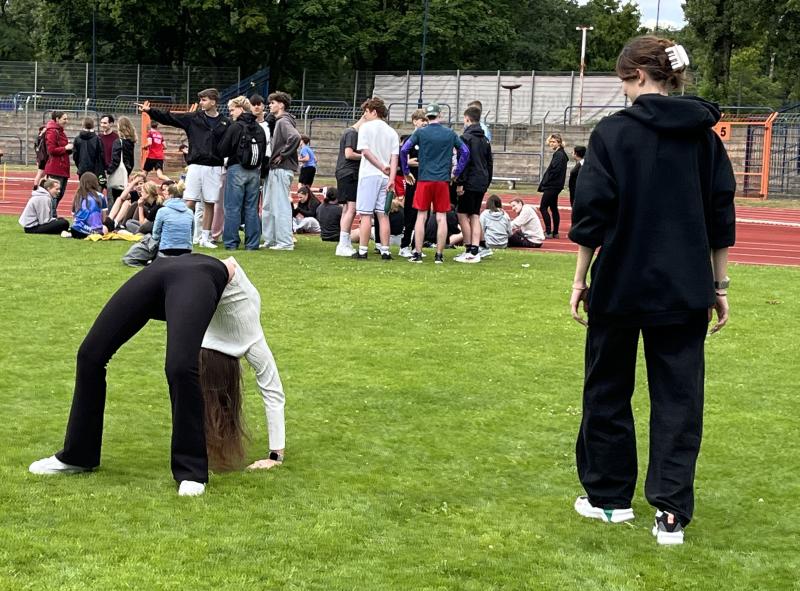 Die Organisatoren der Musikanlage nahmen Wünsche entgegen. Highlight war hier der Song „Junge“ von einer jungen aufstrebenden Band aus Berlin (aus Berlin!). Dadurch entstand eine tolle Atmosphäre und die Schülerinnen und Schüler konnten sich zwischen den anstrengenden Disziplinen besser entspannen und erholen. Pausen wurden auf dem Rasen für verschiedene Ballsportarten und Frisbee-Werfen genutzt.