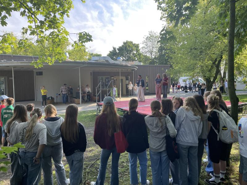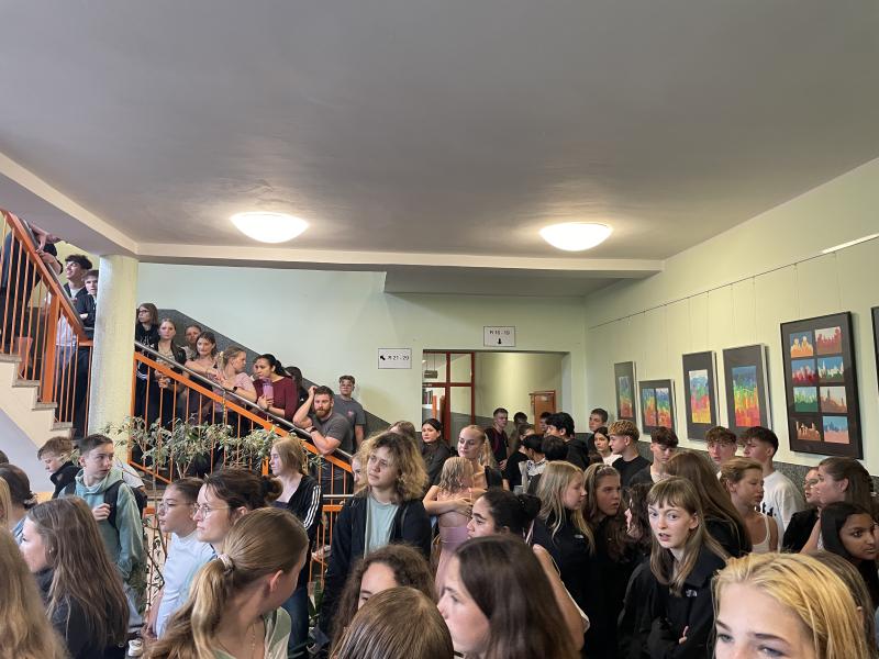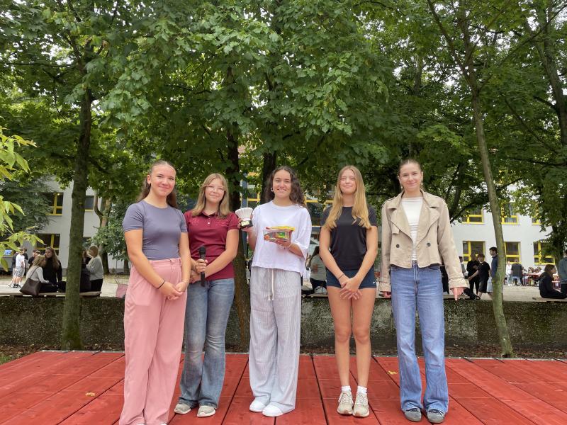 Auf der Bühne wurde ein abwechslungsreiches Programm geboten. Xenia und Mia (Klasse 7e) führten charmant und souverän durch das Programm. Die Klasse 10b wurde als Siegerin des Tapas-Wettbewerbs ausgezeichnet. Es gab ein Duell zwischen den Klassenlehrkräften und den Klassensprechern der siebten Klassen - der Sieg für die Lehrer war äußerst knapp.