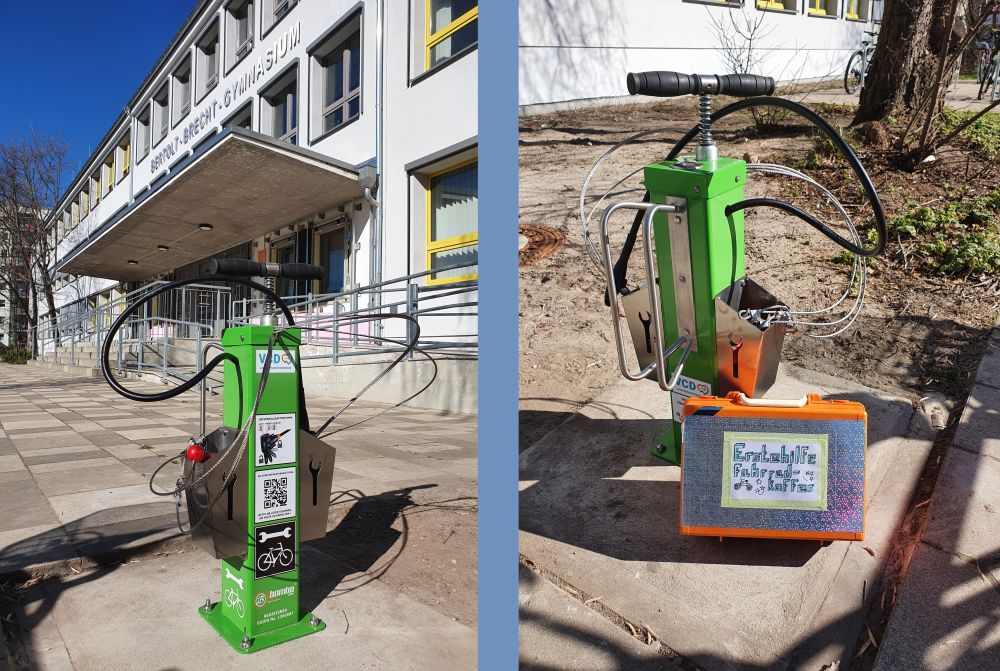 Die Fahrradstation am Bertolt-Brecht-Gymnasium ist eine von inzwischen 6 Stationen in Brandenburg an der Havel und wird der Allgemeinheit vom VCD (Verkehrsclub Deutschland) zur Verfügung gestellt. Der Notfallkoffer in der Schule wurde durch Privatspenden und durch den Förderverein der Schule möglich gemacht. Dafür möchten wir uns bedanken.